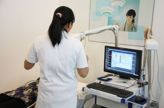 慈銘奧亞健康管理醫(yī)院的護士為參會者測量體脂肪數(shù)據(jù),數(shù)據(jù)可直接上傳至慈銘健康管理云服務平臺